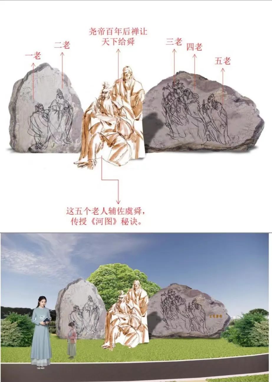 古代帝王授命于天,替天行道,故稱天子。于是,歷代帝王及其王權(quán)都希望得到上天之認(rèn)可,這便是祥瑞出世,順天應(yīng)命。堯通過考察,覺得舜有擔(dān)當(dāng)、行德孝,欲讓天下給他,但不知天意如何。偶逢九月九日,便率領(lǐng)舜等大臣登上首陽山,觀察大河及河西之洛河、涇河。這時(shí),有五個(gè)老人也在游河渚,乃是二十八宿的精靈昴日雞。其中一老告訴堯舜說:“河圖將來告帝期。”二老曰:“河圖將來告帝謀。”三老曰:“河圖將來告帝書。”四老曰:“河圖將來告帝圖。”五老曰:“河圖將來告帝符。”然后化為流星,飛升上入昴宿。不久,有兩條紅胡子龍負(fù)圖而出,堯與舜共同觀看,上邊寫道:“帝當(dāng)樞百則禪虞。”說堯帝百年后禪讓給舜。帝堯便感嘆道:“天之歷數(shù)在爾躬!”原來,上天的歷數(shù)落在你的身上!于是,便把天下禪讓給了舜。這五個(gè)老人為了教導(dǎo)輔佐虞舜,傳授《河圖》秘訣,便落戶在了永濟(jì)的虞鄉(xiāng),就是五老峰?!渡胶=?jīng)》即根據(jù)五老《河圖》演繹而成,沒有五老峰,便沒有《河圖》。